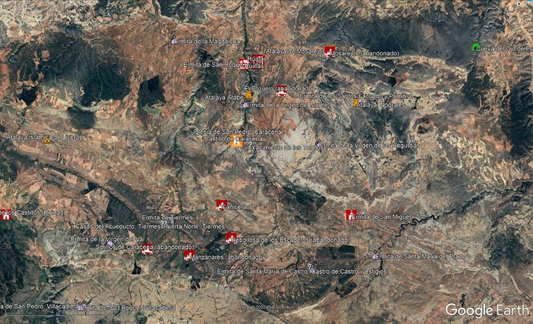 Lo interesante de LUGARES DE ESPAÑA PRO es que, gracias a esta herramienta, no sólo descubrimos un precioso castillo como el de Caracena, sino que además, rápidamente y sin esfuerzo, podemos identificar que muy cerca de él se encuentran muchos más lugares interesantes: dos yacimientos arqueológicos (Tiermes y Los Tormos), algunas bonitas ermitas (San Pedro, San Roque, El Monte, ...) y varios pueblos abandonados (El Pozuelo, Cañicera, Rebollosa de los Escuderos, etc.), que muy probablemente habrían pasado desapercibidos para nosotros de no contar con la herramienta LUGARES DE ESPAÑA PRO.