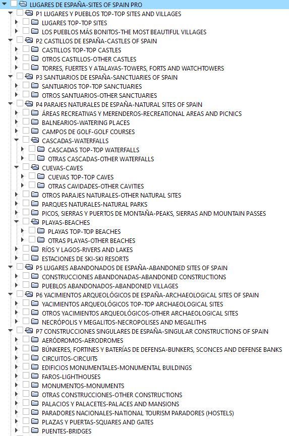 Esta es la estructura de LUGARES DE ESPAÑA PRO y los iconos que representan cada una de las categorías de los sitios*:
