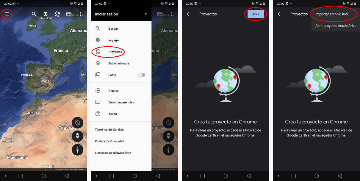 Para utilizar la herramienta LUGARES DE ESPAÑA PRO con la app Google Earth en tu smartphone o tablet, una vez descargada e intalada la app Google Earth en tu dispositivo móvil, simplemente tendrás que abrir el archivo KML de LUGARES DE ESPAÑA PRO en la App Google Earth de la siguiente forma: